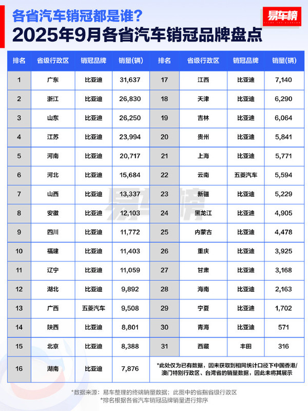 今日,2025年9月中国各省汽车销冠品牌及车型盘点结果正式揭晓。数据显示,比亚迪在品牌层面表现强势,斩获全国28个省级行政区的销冠品牌头衔。而在车型榜单中,特斯拉Model Y在4个省份销量夺冠。