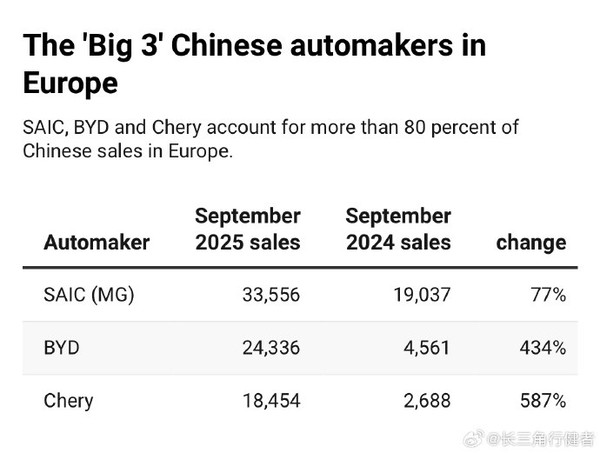 除三大品牌外,其他中国车企同样增势强劲。吉利集团(包括领克、极氪、莲花品牌)9月销量合计7465台,同比增长36%。该机构称,今年1至9月,中国车企在欧洲市场累计销量已达522587台,同比增长83%,预计全年销量将再创新高。