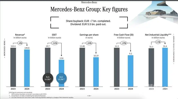 更严峻的是,奔驰预计2025年利润还将大幅下降,息税前利润、自由现金流将显著低于2024年。根据现行劳资协议,奔驰不能强行解雇员工,故推出自愿离职补偿计划,目标覆盖超3万名员工。