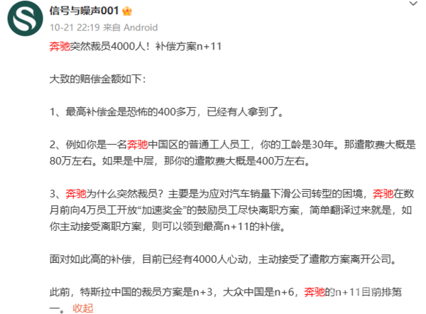 【科技】近日,汽车行业风云再起,有消息称奔驰正在实施其有史以来最大规模的裁员计划。据了解,截至10月20日,已有约4000名员工接受遣散方案离职,有人最高拿到400多万元的补偿金。