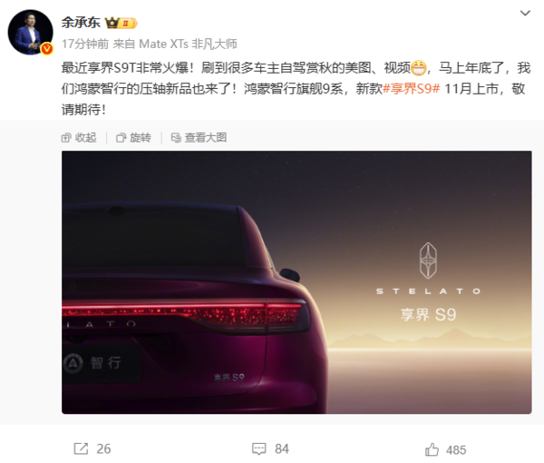 10月27日,华为常务董事、终端BG董事长余承东通过社交媒体宣布,鸿蒙智行旗舰车型新款享界S9将于11月正式上市,并将其称为鸿蒙智行今年的“压轴新品”。