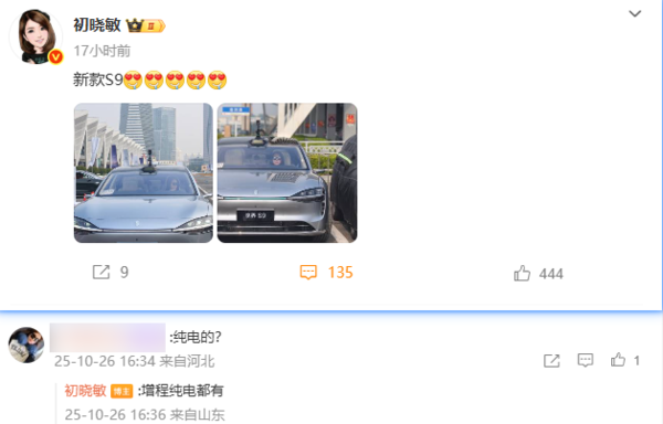 近日,有博主分享了该车的外观图。新车提供银灰色车漆(有望为现款的深空灰配色)、采用家族式前脸设计、“享界”的车标正式上车。有用户询问新车是否为纯电动力,博主回复称:“增程纯电都有。”