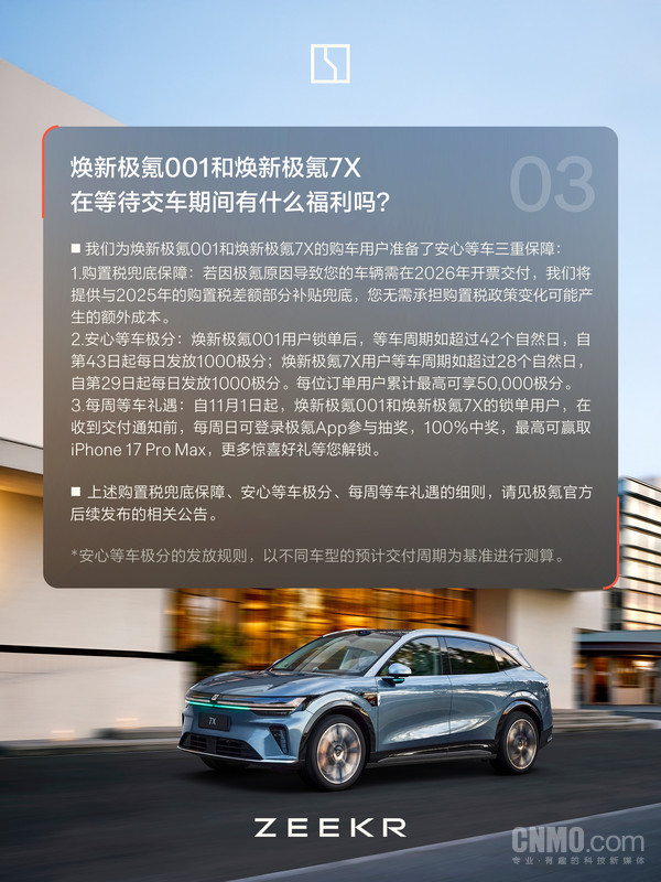 自11月1日起,焕新极氪001和焕新极氪7X的锁单用户,在收到交付通知前,每周日可登录极氪App参与抽奖,且100%中奖,最高奖品为iPhone 17 Pro Max。
