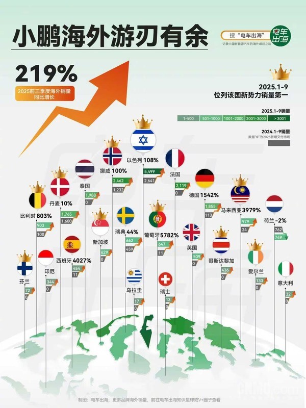 从具体市场表现来看,小鹏汽车在部分区域市场的增长堪称惊人。在涵盖21个国家及地区的范围内,其销量同比增幅高达219%。在丹麦、挪威等10个国家,小鹏汽车更是力压群雄,位列中国新势力品牌销量榜首,充分彰显了其在海外市场的强大竞争力和品牌影响力。