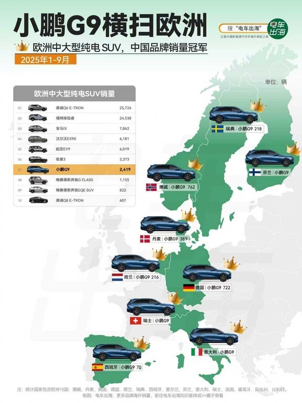 小鹏汽车1-9月海外累计交付29706辆 G9获欧洲九国销冠