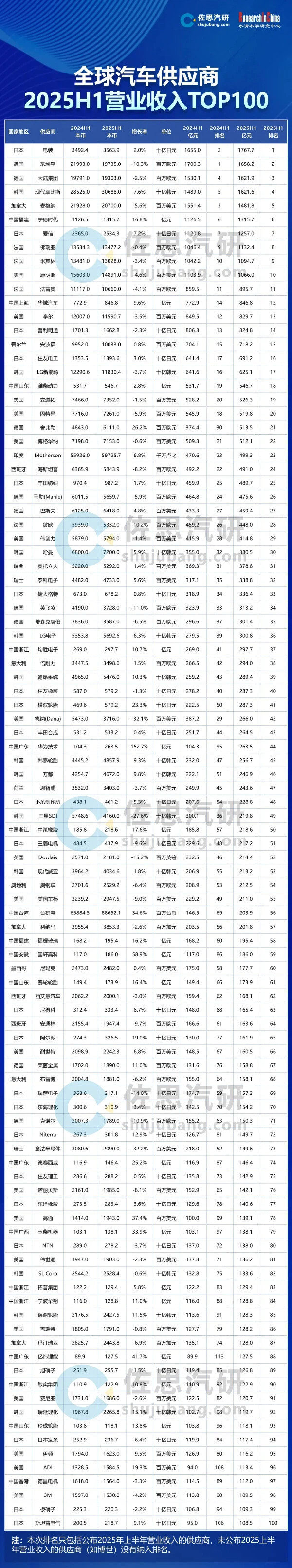 全球汽车供应商2025H1营收TOP100出炉 华为排名猛涨