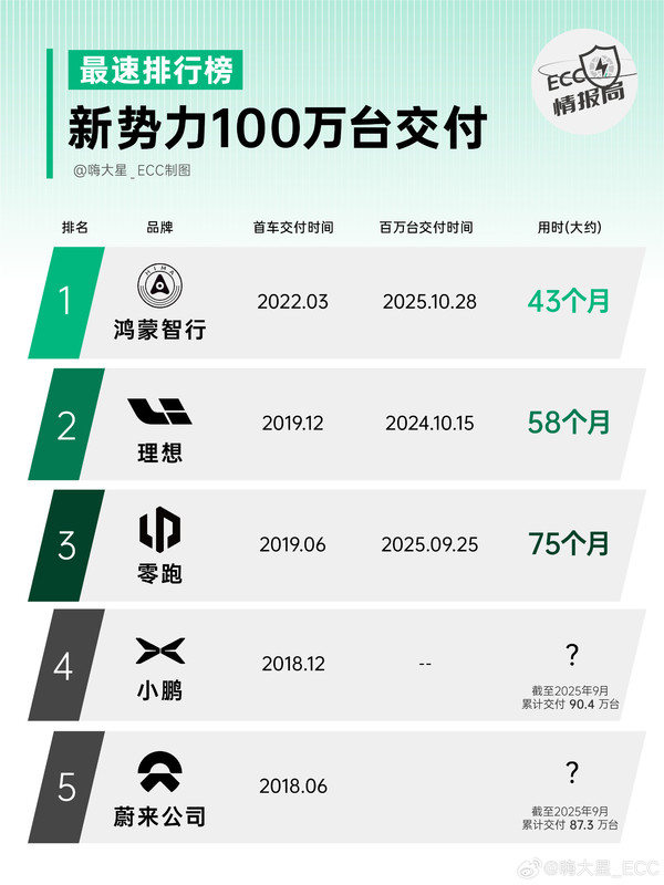 上述博主还整理出了“新势力车企100万台最速排行榜”。鸿蒙智行以约43个月领跑全场,排名第二的理想则为58个月,零跑汽车也进入前三,用时约75个月。此外,小鹏和蔚来公司也将很快进入“百万交付俱乐部”。