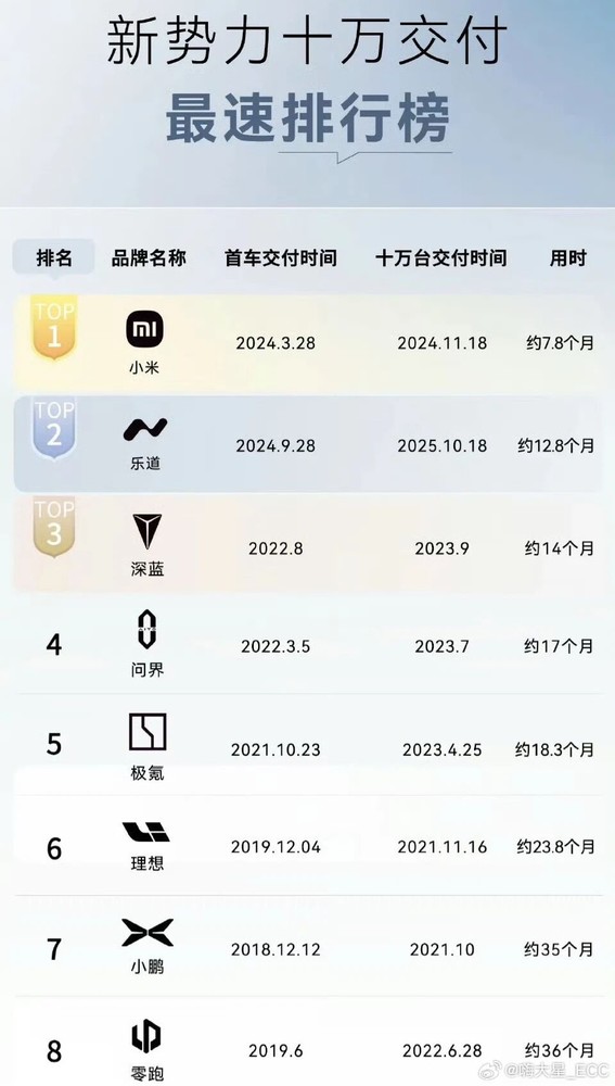 注意到,小米汽车以绝对优势夺得榜首——自2024年3月28日首车交付起,仅用约7.8个月便达成10万台交付,成为当前新势力车企中最快达成该里程碑的品牌。紧随其后的是乐道汽车,其2024年9月28日启动交付后,在2025年10月18日达成目标,用时约12.8个月。