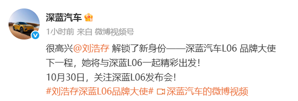 10月29日,注意到,深蓝汽车官方正式宣布:青年演员刘浩存正式担任深蓝L06品牌大使,并将出席10月30日19:00举办的深蓝L06全球预售发布会。