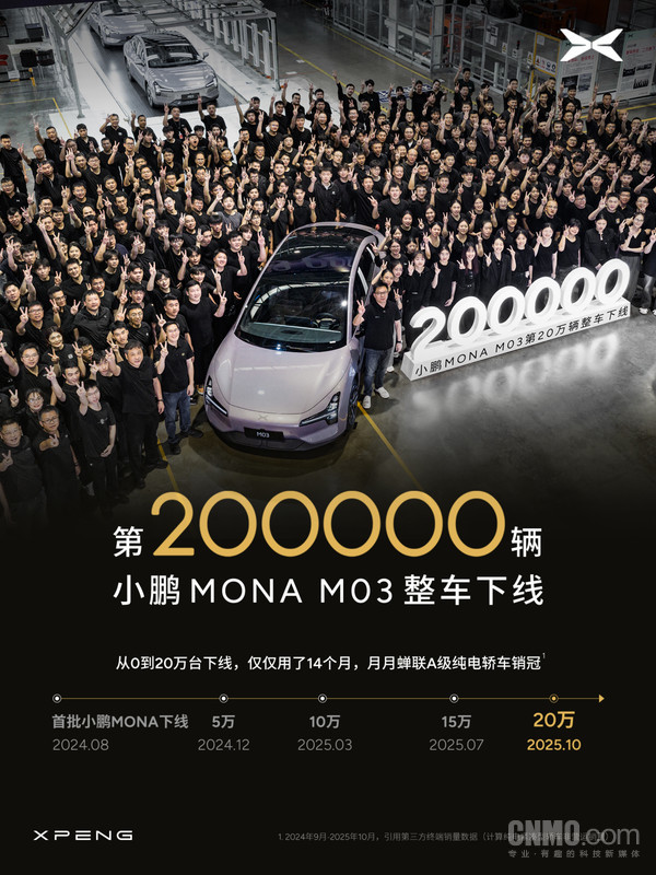 官方信息显示,首批小鹏MONA M03于2024年8月正式下线,至12月,下线数量达到5万台;2025年3月,下线量突破10万台,至7月,下线数量达15万台。从0到20万台下线,小鹏MONA M03仅仅用了14个月,并且还月月蝉联A级纯电轿车销冠。