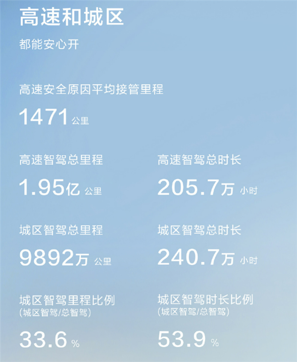 其中高速智驾总里程1.95亿公里,安全原因平均接管里程1471公里;城区智驾总里程9892万公里,城区智驾里程比例(城区智驾/总智驾)33.6%;高速智驾总时长205.7万小时,城区智驾总时长240.7万小时,城区智驾时长比例(城区智驾/总智驾)53.9%。