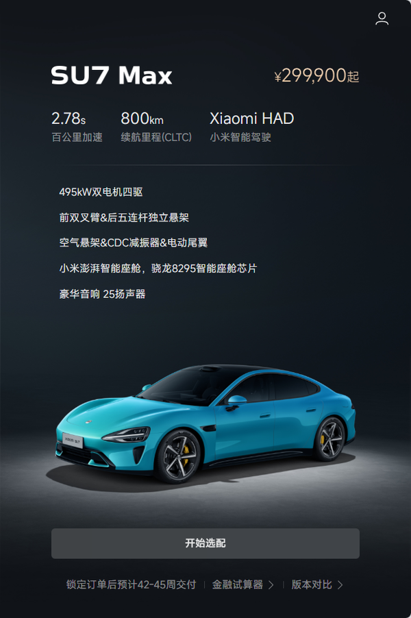 小米汽车官网显示,锁定订单后,小米SU7标准版预计46周至49周(322天至343天)交付、小米SU7 Pro预计45周到48周(315天至336天)交付、小米SU7 Max预计42周到45周(294天至315天)交付。小米SU7 Ultra的等车时间最短,但也达到了18周到21周(126天至147天)。