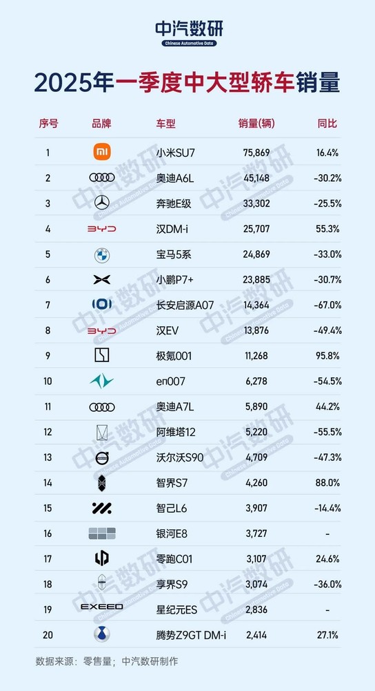 2025Q1中国中大型轿车销量排名:小米SU7断层领先