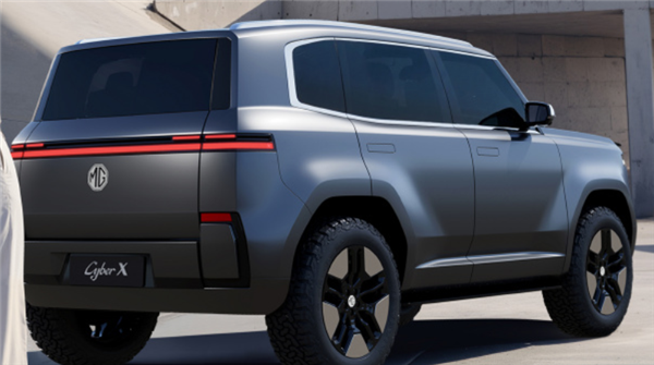 侧面来看,MG Cyber X拥有较短的前后悬,离地间隙高,配备隐藏式门把手、银黑双色外后视镜罩和银色车顶行李架,搭载20英寸多辐轮辋,配265/55 R20轮胎。
