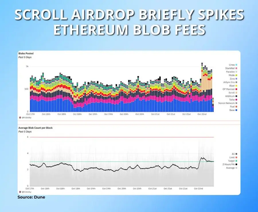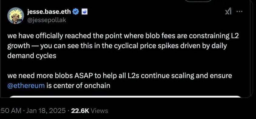 根本原因在于:L2链对有限Blob空间的需求不断增长,导致基础费用飙升。每笔交易都需要Blob空间,任何L2优化都无法解决这个核心瓶颈。