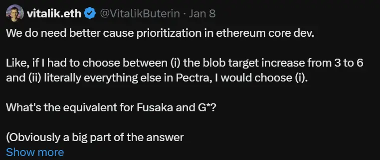 Vitalik Buterin也指出,将Blob数量从3增加到6是Pectra升级中最关键的部分,但这仅仅是权宜之计。