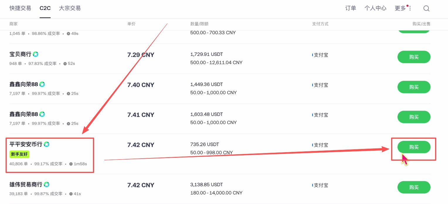平台就会为我们筛选出符合要求的商家了,我们要找成单量和成交率高的商家来进行购买。我们来看一下,比如说“平平安安币行”这一家,他有一个4万单的成交量,同时他的好评率是99.17%,我们就可以跟这家来进行购买。点击后面的【购买】。