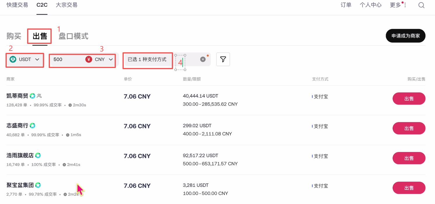 在上方我们选择“C2C”,也就是个人对个人交易。下方选择【购买】,要购买的币种是USDT。然后你可以在这里面去筛选一下要购买的金额,后面的CNY就是人民币的意思。比如说我们想要购买500人民币的USDT就输入500。然后选择 一下支付方式,分别有银行卡、支付宝还有微信支付,你习惯使用哪种方式支付就使用哪种方式支付。比如说我习惯使用支付宝,我就勾选“支付宝”。