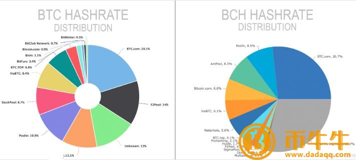 在比特币网络诞生的第二年,处理能力仅为每秒10000、0000、0000(10万亿)哈希(10 TH / s)。由于技术有了很大的改进,单个采矿设备现在可以生产10 以上TH / s。在2017年分裂的第二年周年之后,BCH哈希值增加了几千倍,网络每秒保持两个五分之一的哈希值。BCH链条约有14-15名已知矿工,约29%来自未知池的总哈希值。目前有12名知名矿工处理BTC在交易中,14%的采矿权也由未知矿工控制。此外,六个著名的BTC采矿池也开采了BCH链,因为在任何时候都有专门用于两个网络的持续哈希。四个最大的BCH采矿池是Btc.com,Antpool,Poolin和Bitcoin.com,Btc.com也是比特币网络上最大的游泳池开采,其次是F2pool,Antpool和Poolin。