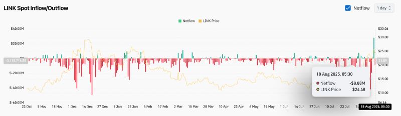 除了期货数据外,链上指标也呈现出积极的趋势。Chainlink 记录了 2025 年全年交易所的持续流出,表明长期持有者正在增持。1 月至 8 月期间,零星的流入激增与价格小幅反弹同时出现,表明这是短期获利了结,而非大规模的抛售。