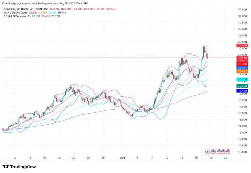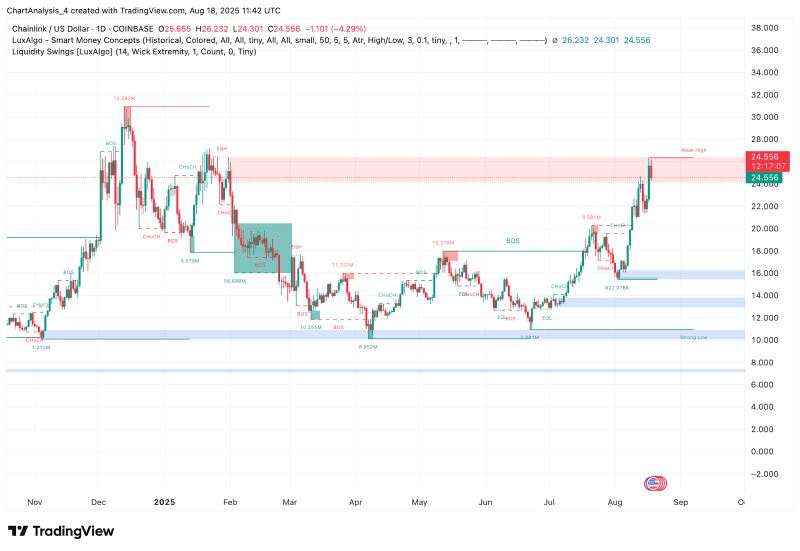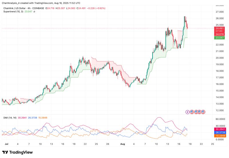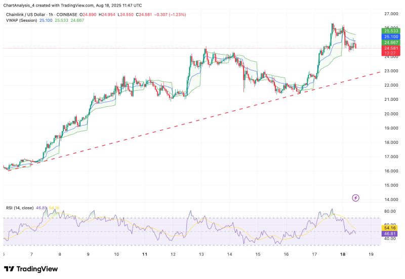 Chainlink 今日价格在 24.5 美元附近盘整,较近期高点 26.2 美元下跌 4.2%。LINK 突破 26-27 美元阻力位,短期内面临抛售压力,但其仍维持在关键动态支撑位上方。由于动量指标和流动性信号均呈现混合信号,交易员们目前正在关注 LINK 能否守住近期涨幅,还是会陷入更深的回调。