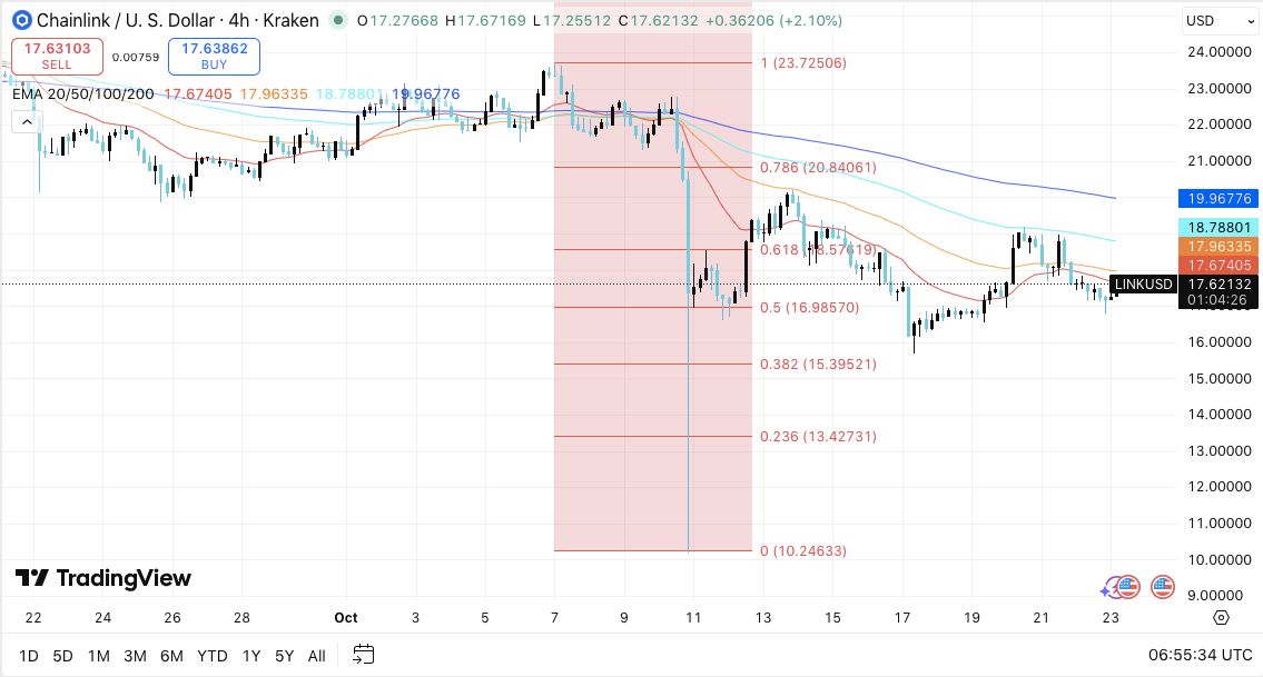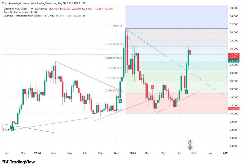 - 下行水平: 16.98 美元是关键支点,代表 50% 斐波那契回撤位支撑位。在此之下,15.39 美元(斐波那契 0.382 美元)和 13.42 美元(斐波那契 0.236 美元)定义了次要支撑位。跌破这些水平可能会导致 LINK 面临更深的回调,跌向 10.24 美元的周期低点,从而延长回撤结构。