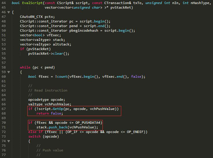 经翻阅源码,发现OP_PUSHDATA4指令被定义为78.所以当函数遇到OP_PUSHDATA4时,指针会向又移78 4=82位,其中78位数据会被压入栈,所以只要在txin.scriptSig中注入一个OP_PUSHDATA4操作码,后面的公钥信息以及OP_CHECKSIG指令都会被”吃掉”并作为参数入栈,当指针走到最后时,进行最后的判断: