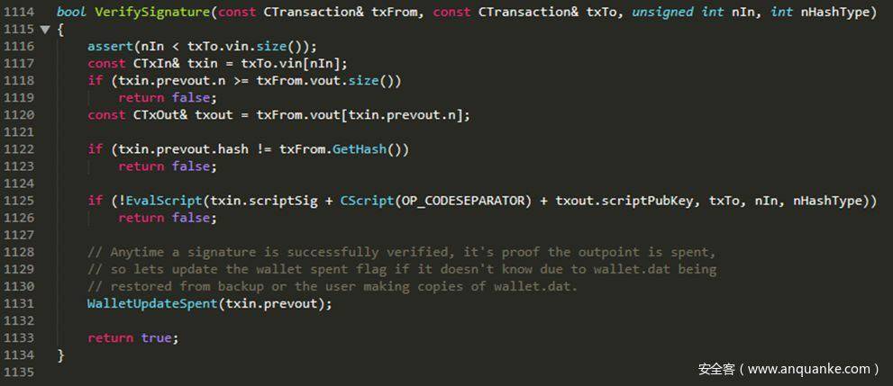 执行每个交易都会调用VerifySignature函数,该函数用于执行脚本以及验证签名,然后给交易标注是否被花费。