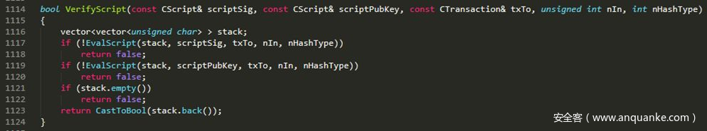 首先txFrom参数是上一笔交易,txTo是正在处理的这笔交易,如果理解了上面的章节中讲解过的UTXO模型,这里就不难理解了。重点看1125行代码,调用了EvalScript函数,第一个参数是txin.scriptSig(包含签名信息) 分隔操作码OP_CODESEPARATOR txout.scriptPunKey(包含公钥信息、OP_CHECKSIG指令),这些就是EvalScript函数要执行的脚本,后面的参数可以暂时不用管,只要EvalScript函数返回true那么这笔验证签名就通过了。EvalScript函数如何才能返回true?