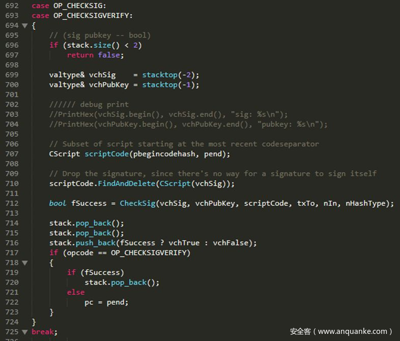 上面代码不难理解,调用Checksig函数来验证签名,然后返回给FSuccess变量,如果为真就压一个vchTrue(非0)进栈,否则就压一个vchFalse(0)进栈;如果opcode是OP_CHECKSIGVERIFY而不是OP_CHECKSIG的话就让vchTrue出栈,并开始执行后面的操作码。