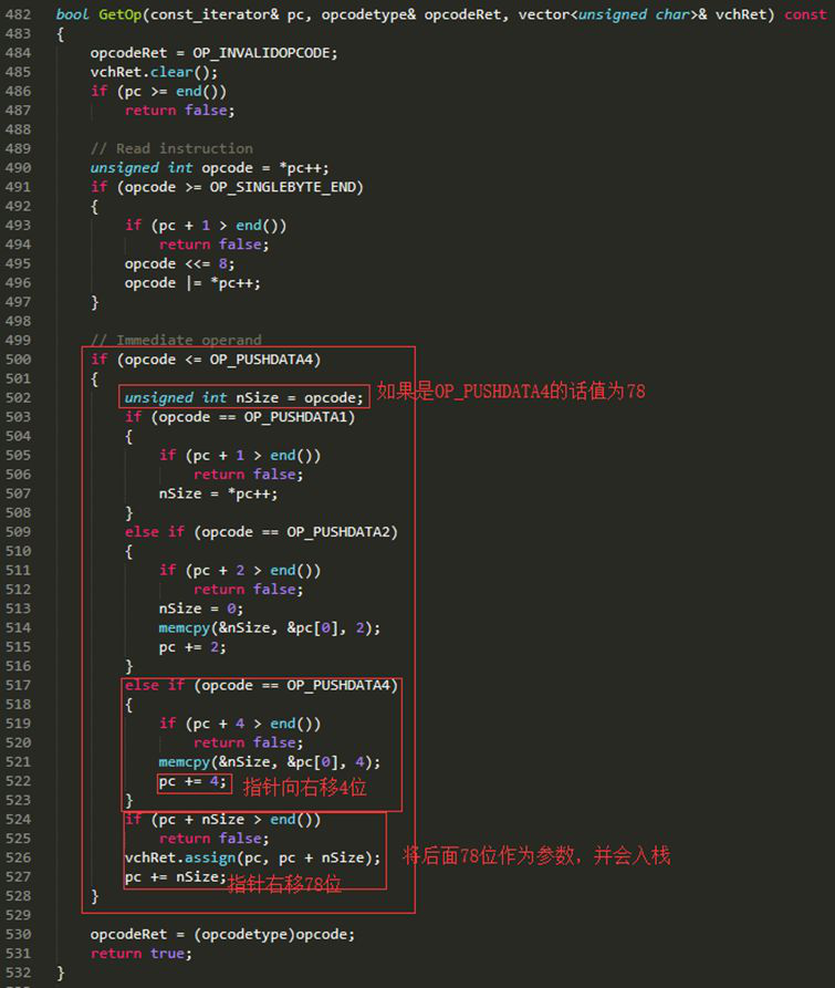 第一个变量可控,而且是作为脚本执行,所以这个变量可以不仅仅是签名信息,还能是opcode,这就好办了,下面需要引用一个神奇的操作码OP_PUSHDATA4.我们看看比特币0.3.3是怎么处理这个操作码的: