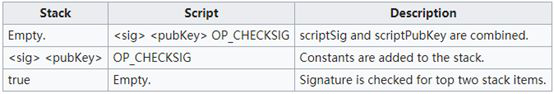 先填入要执行的脚本(Script),然后签名(sig)和公钥(pubKey)被压入堆栈,然后操作码OP_CHECKSIG会去验证签名等,若验证通过就将true压入堆栈,否则就将false压入堆栈。