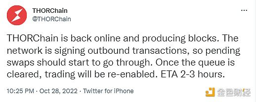 10月28日消息,跨链DeFi协议 THORChain 已重新上线并生产区块。网络正在签署出站交易,因此挂起的交换应该开始通过。一旦队列被清除,交易将被重新启用。预计 2-3 小时。在网络中断期间,投资者没有损失任何资金。然而,Thorchain 的原生币 RUNE 的兑换存款和取款在 Kucoin 等中心化交易平台被暂停。