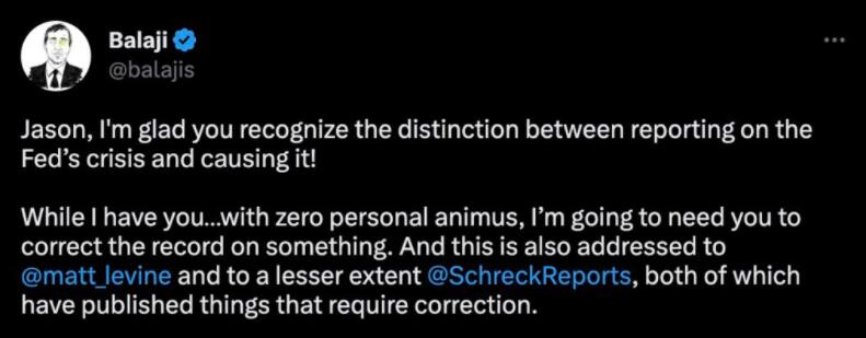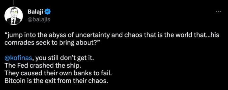 最后,在另一则回复推文中,Balaji再次强调了比特币可能是逃离联准会政策造成混乱局面的出口:联准会撞毁了这艘船,他们导致自己的银行倒闭。比特币是逃离混乱局面的出口。
