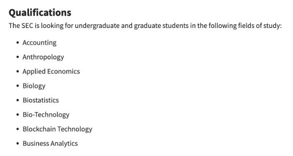 根据招聘讯息,SEC正在寻找研究区块链、分布式账本技术、计算机科学、金融科技或网络安全以及许多其他研究领域的专职学生,而招收的本科生和研究生将参加8月28日开始为期10周的实习,并于11月3日结束,同时实习生每周必须至少工作16小时。