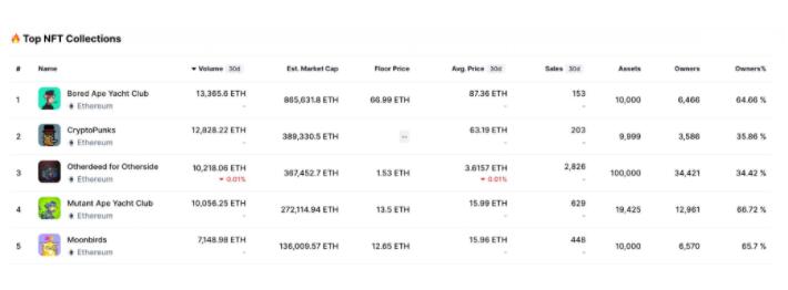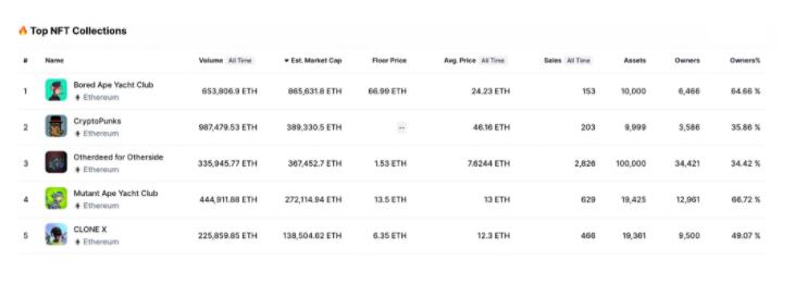 截至 2022 年 8 月 23 日,Bored Ape Yacht Club 市值依然排名第一。值得注意的是,BAYC 在 10.000 个收藏品中,仅有 6446 个的持有者。这意味着,BAYC 收藏品中 NFT 的稀缺性也是其成立以来价格上涨和 floor price 上涨的驱动因素。