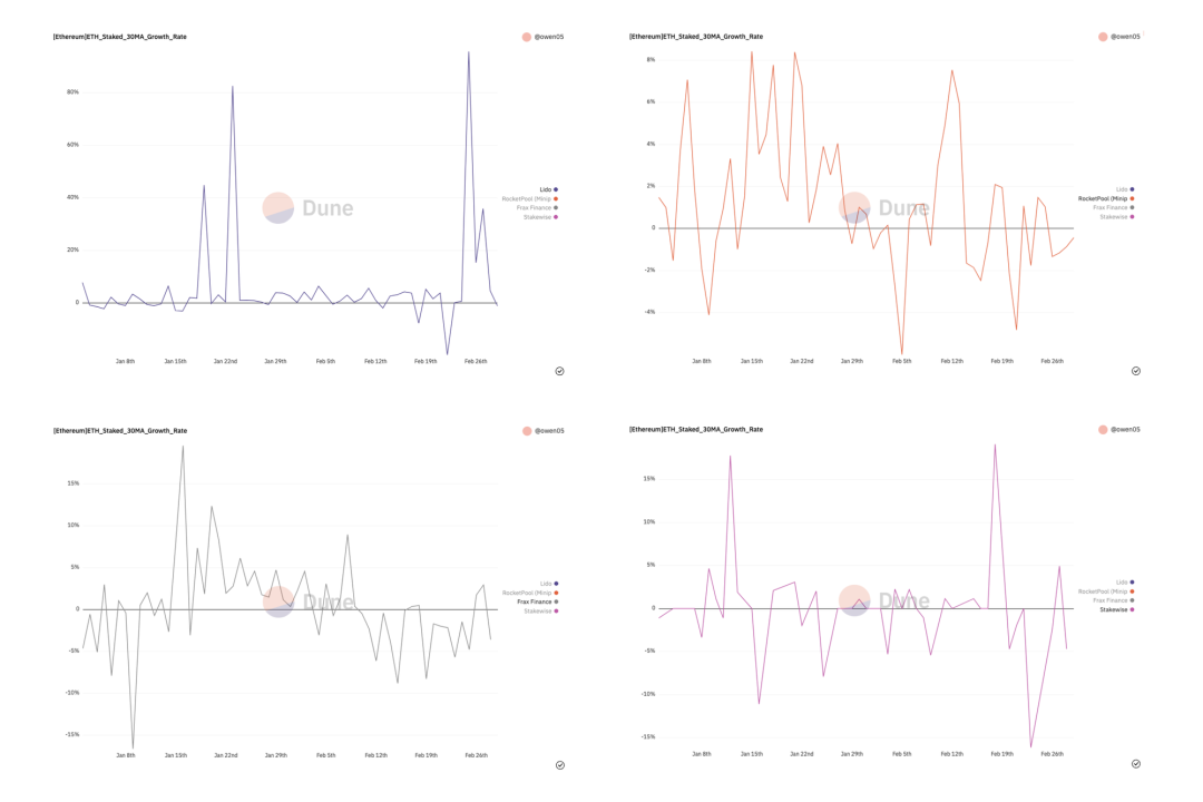Lido 的增长率一直很高,大部分时间保持增长状态,并多次有大额质押带动巨额增长。 Rocket Pool 增长率基本为正,近期波动收窄。 Frax 一月份到二月初增长率保持较高水平,近期增长率为负,表现不佳。 Stakewise 在大部分时间增长率较低或为负,市场竞争力差。