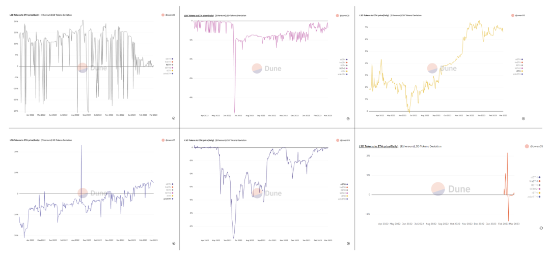 stETH 在去年 Luna 崩盘等行业性事件中有大幅脱锚的情况,脱锚维持一段时间后回复锚定,总体来看能维持锚定。SETH2(Stakewise)与 stETH 类似。 RETH(Stafi)波动较大。 rETH(Rocket Pool) 长期保持溢价且溢价有所上升。 ankrETH 曾大幅折价,近期恢复锚定。 frxETH 数据较少,早期波动较大。