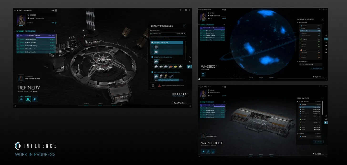 Influence 是一款备受期待的 3D 太空战略沙盒 MMO,背景设定在 Adalia 星系的小行星带。该游戏采用第三人称游戏方式,允许玩家控制飞船和设施、殖民小行星、参与战斗、开发建筑、创建社区并扩大他们在宇宙中的影响力。所有游戏内资产均为玩家所有,包括 Adalia 的 250,000 颗小行星,每颗小行星都具有独特的资源组合,可以开采并提炼成各种产品,这些产品可以在公开市场上交易。