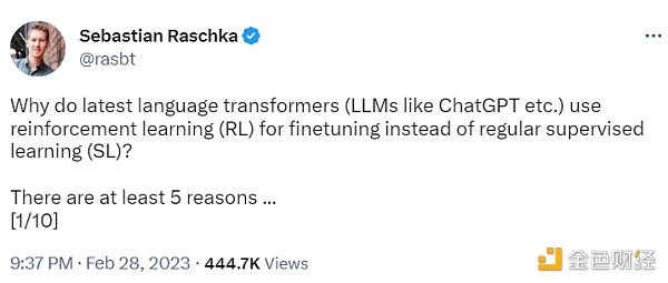 ChatGPT 使用来自人类反馈的强化学习(RLHF),通过最小化偏差对模型进行微调。但为什么不是监督学习(Supervised learning,SL)呢?一个基本的强化学习范式由用于训练模型的标签组成。但是为什么这些标签不能直接用于监督学习方法呢?人工智能和机器学习研究员 Sebastian Raschka 在他的推特上分享了一些原因,即为什么强化学习被用于微调而不是监督学习。