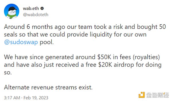 例如,Sappy Seals 团队获得了 50 个自己的 ,然后在 2022 年 8 月开始在 sudoswap 上用这些 做 LP。从那时起,该团队通过交易费赚取了价值数千美元的收入。其他使用这种 LPing 策略并取得类似成功的项目包括 Based Ghouls, Finiliar 和 Allstarz。