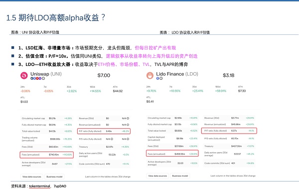 某个赛道的价值发现一般是遵循中游到上下游逐渐扩散的过程,例如LDO等去中心化的质押协议更多的是聚焦中游赛道,不过中游赛道也是率先被价值发现,当前估值水平(P/F≈10X)已经可以同UNI匹配。