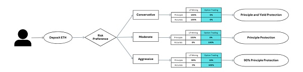 例如LSD收益聚合器协议Shield采用的策略之一是,质押者一半ETH存入LDO,获得主网①节点验证奖励的同时得到流动性质押代币stETH,然后将剩下的一半ETH共同组成stETH/ETH的LP存入curve获得②平台流动性奖励和③curve激励奖励,此举可以将纯质押的收益率提高20-30%;另外如果用户想要获得更高的收益,shield会将部分收益④购入锚定ETH价格的期权获得价格增值的收益,是一款加密世界的“固收 ”产品。