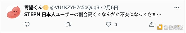 “STEPN日本人的用户比例较高让我感觉有点不安” Credits: https://twitter.com/VU1KZYH7c5oQuq8/status/1490255860731641858