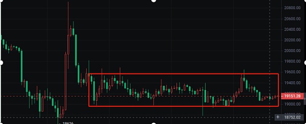从1小时K线图来看,行情一直在上方19000–19500区间震荡,短期没有什么明确的方向性,目前短期在操作策略上适合高抛低吸为主!!
