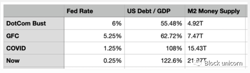 二十年来的努力:美联储利率、债务 / GDP 和 M2 货币供应量导致了过去四次金融危机……