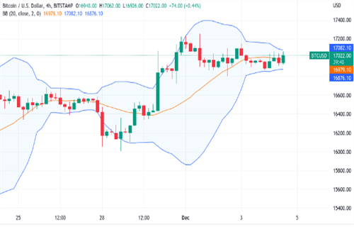布林带收缩预示着波动即将到来,当天,4小时图表带处于11月27日以来的最低水平——就在BTC/USD上涨1000美元之前。