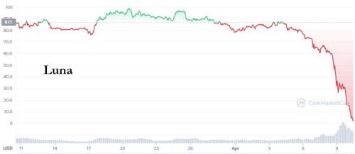 UST的崩溃令本已恐慌的加密市场受到进一步拖累,多头信心进一步丧失,一些最受欢迎的去中心化金融协议的加密货币暴跌。除比特币外,Avalanche暴跌约34%,Solana暴跌超过30%,Aave暴跌25%,TerraUSD的附属代币Luna暴跌约95%。