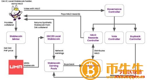 HaloDAO采用UMA协议的去中心化的链外数据oracle (Oracle),或称数据验证机制(DVM),发行本地货币,以DAI兑本地区法定货币(如DAI:UBE的PHP)的汇率合成稳定货币,无需链外价格数据传输(无价)合约。
