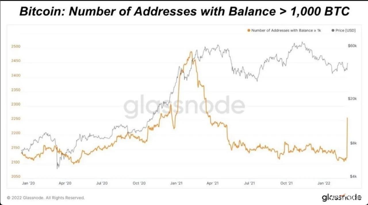 据 Glassnode 数据显示,持有 1000 BTC 以上地址数在短时间内骤增约 150 个。